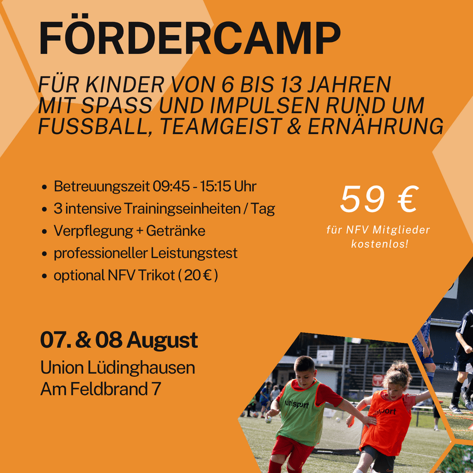 Unsere FörderCamps sind Fußballcamps über zwei bis drei Tage – vollgepackt mit professionellem Training und jeder Menge Spaß. Von morgens bis nachmittags wird in kleinen Gruppen intensiv trainiert. In der gemeinsamen Mittagspause stärken wir uns und tanken Energie für die nächste Einheit. Perfekt für alle, die in den Ferien richtig durchstarten wollen!
